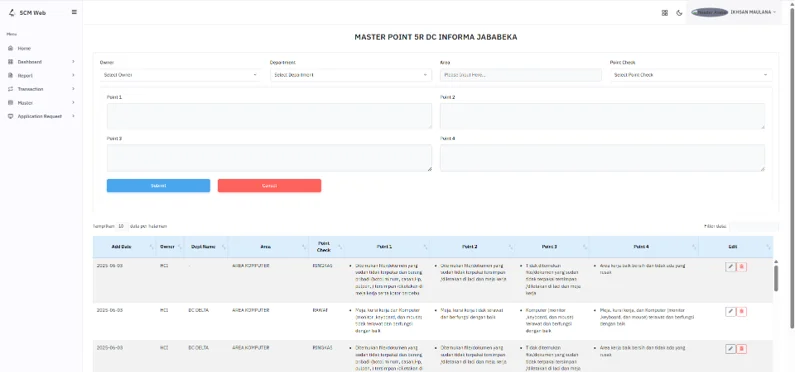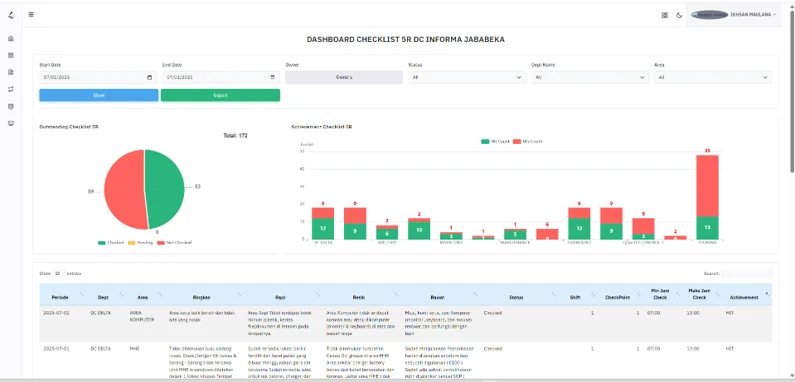 - Progress Checklist 5R – Modul pemantauan progres implementasi 5R (Ringkas, Rapi, Resik, Rawat, Rajin) di area operasional