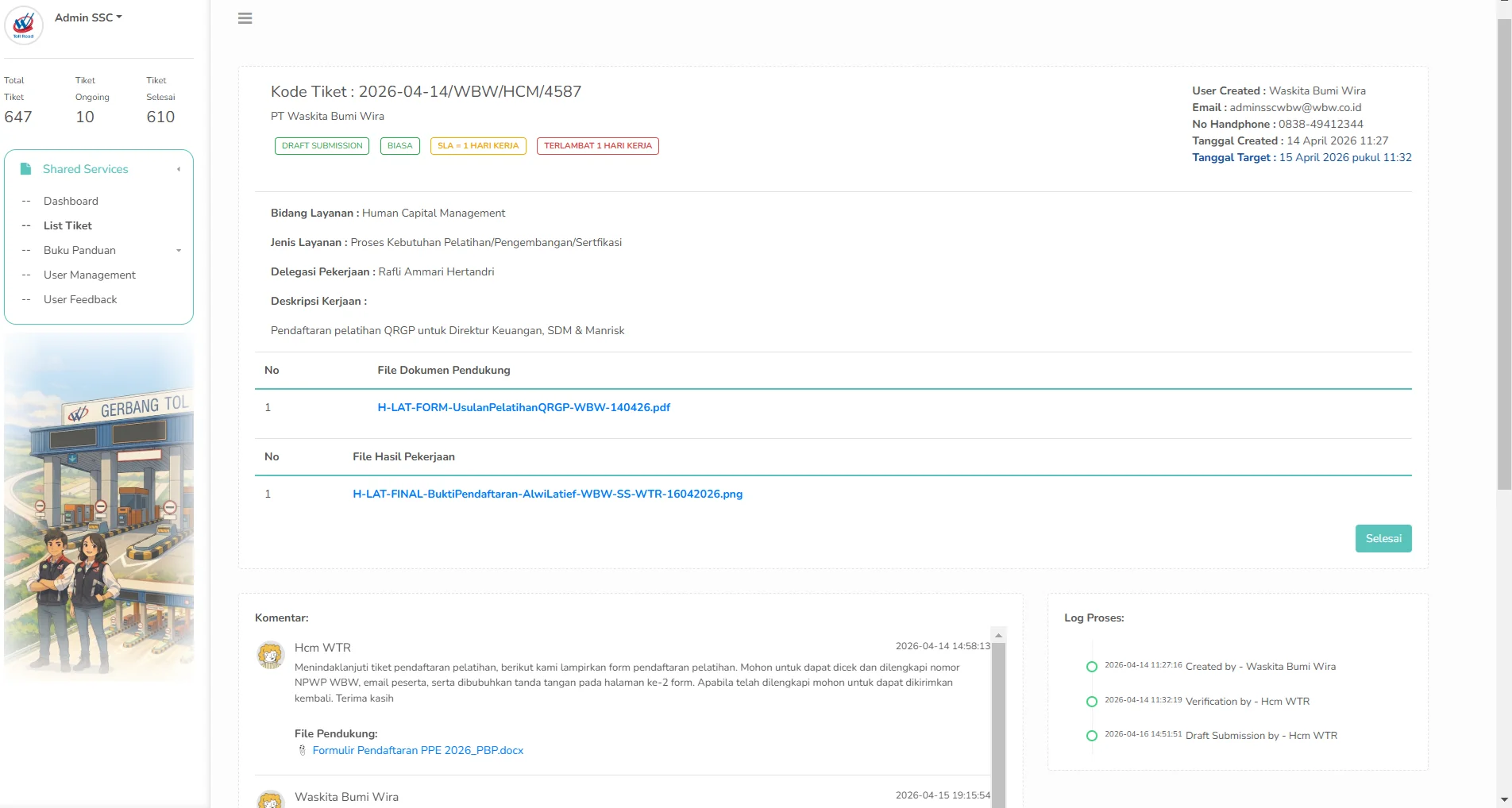 Aplikasi ini menggantikan komunikasi manual yang tersebar dan meningkatkan transparansi, akuntabilitas, serta kepatuhan terhadap SLA (Service Level Agreement) di seluruh bidang layanan Shared Service.