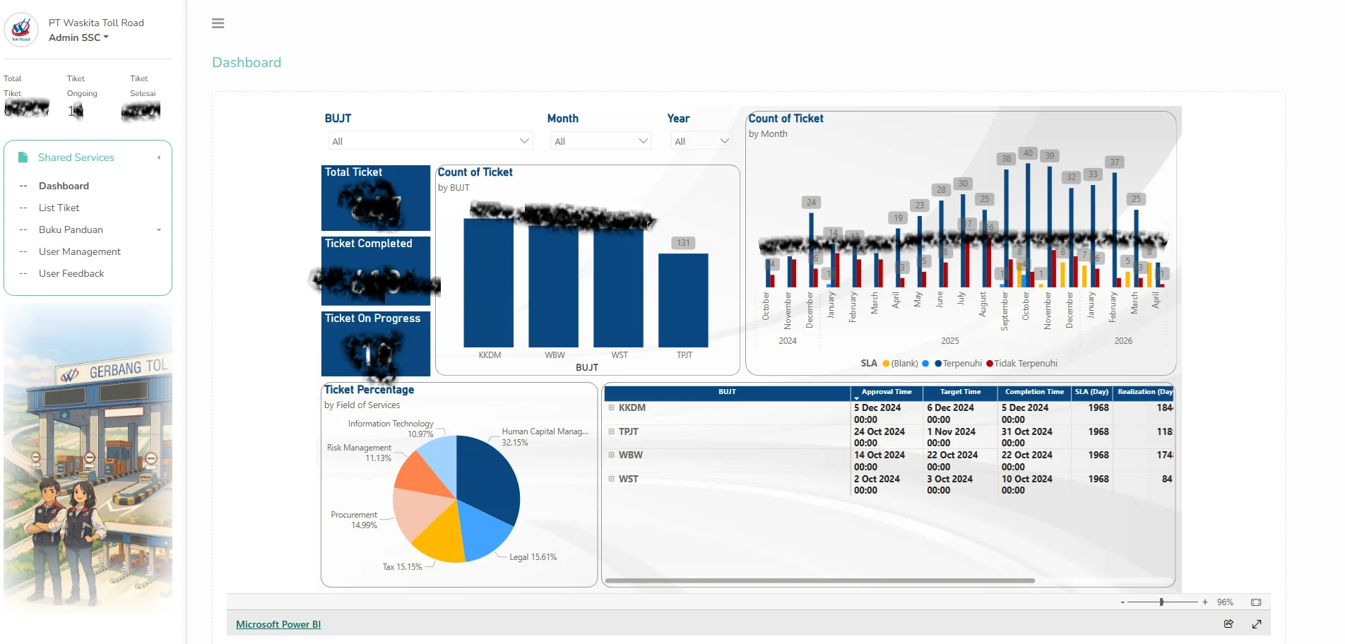 - Dashboard Analitik – Visualisasi data tiket real-time mencakup Total Ticket, Ticket On Progress, Ticket Completed, Count of Ticket per BUJT, dan Ticket Percentage by Field of Services