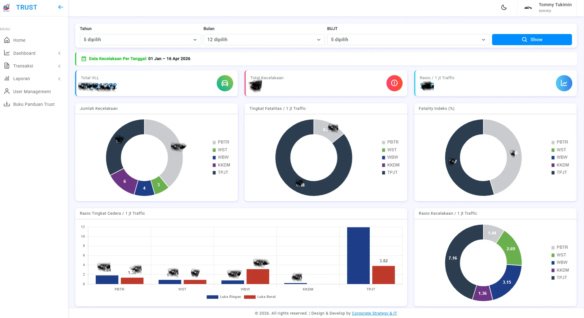 TRUST adalah aplikasi dashboard web untuk Divisi Manajemen Operasi & Pemeliharaan PT Waskita Toll Road, mencakup monitoring Lakalantas, VLL & HPT, serta Operation & Maintenance.