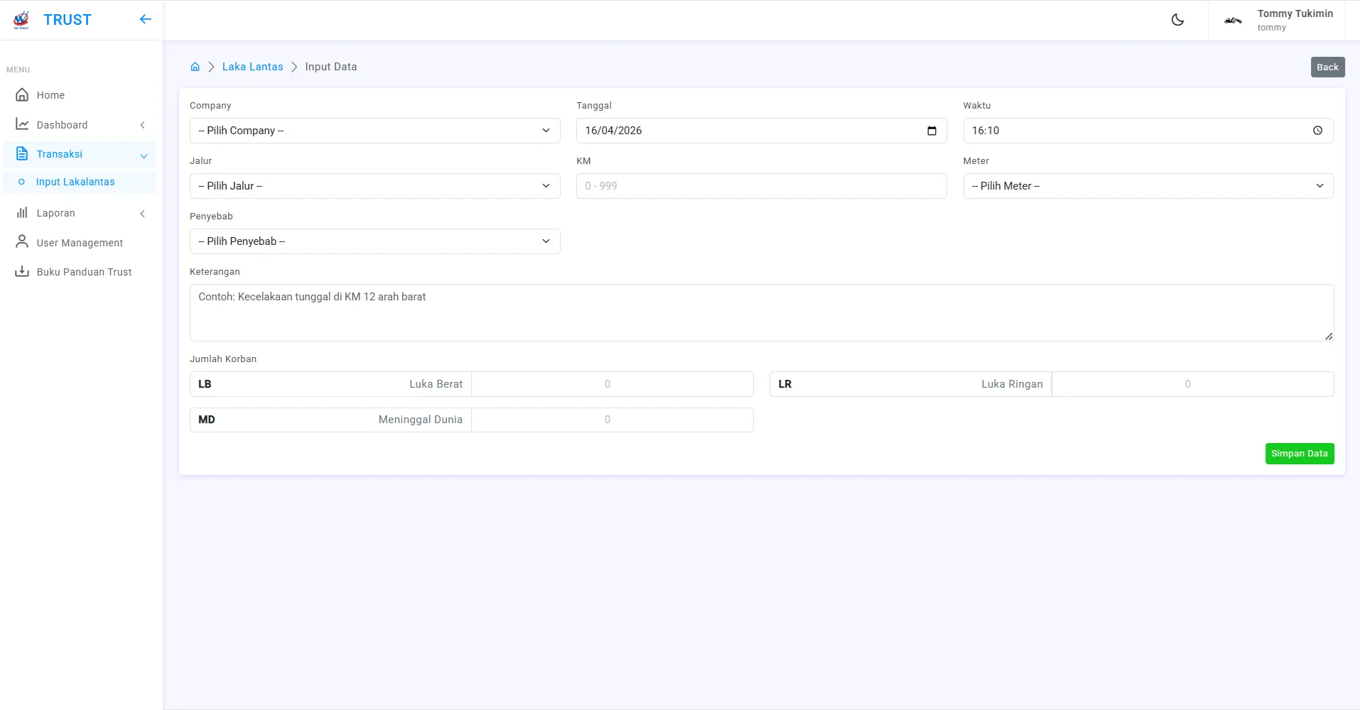 - Input Data Lakalantas – Pencatatan data kecelakaan secara terstruktur meliputi lokasi (KM, jalur, meter), penyebab, dan jumlah korban (LB, LR, MD)