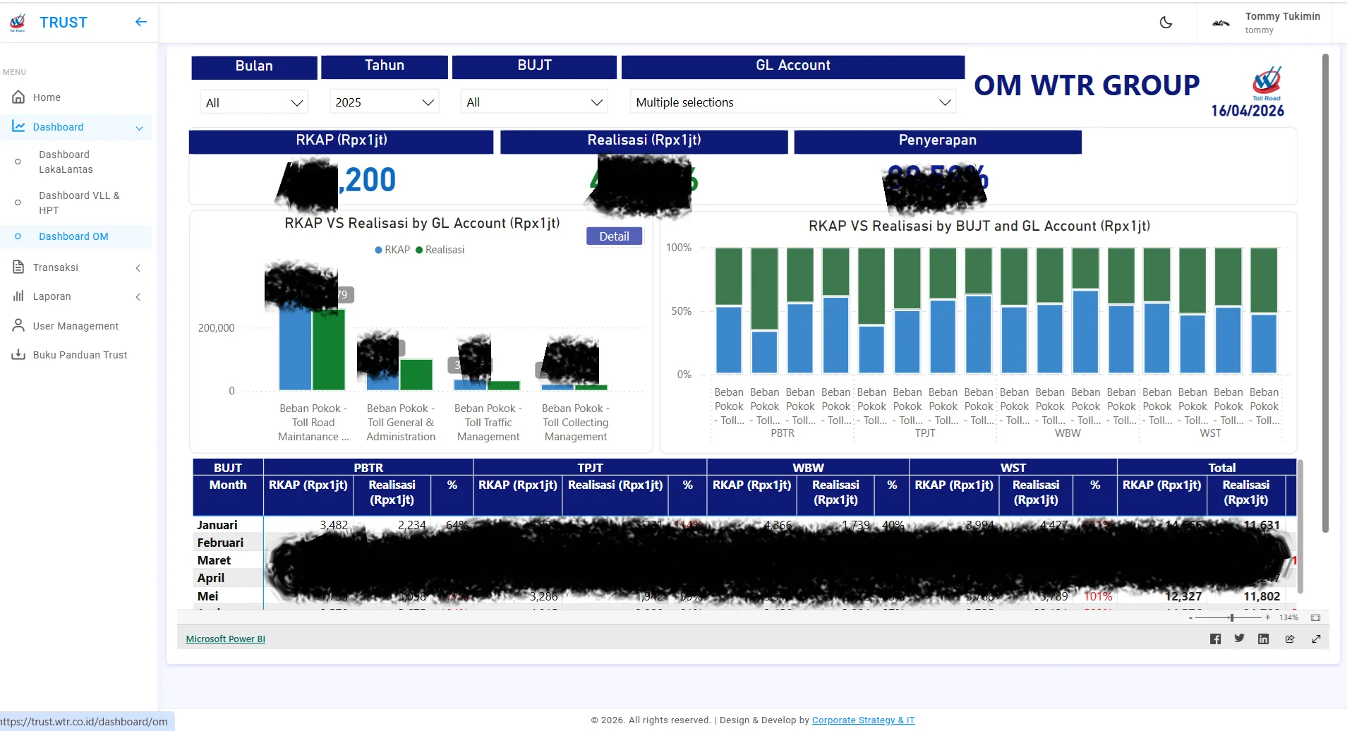 - Dashboard OM (Operation & Maintenance) – Pemantauan aktivitas operasi dan pemeliharaan jalan tol